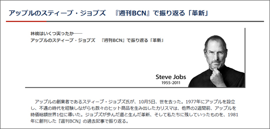 多くの方がご存じの通り、現地時間10月5日、アップル共同創業者のスティーブ・ジョブズ氏が亡くなった。前日、iPhoneの新モデル「iPhone 4S」を発表したばかり。発売日を待つことなく、56歳の若さで旅立ってしまった。BCNでは、哀悼の意を込め、創刊30周年を迎える業界紙『週刊BCN』と、ウェブサイト『BCNランキング』『BCN Bizline(旧名称Web BCN)』の膨大な過去記事のなかから、ジョブズ氏やアップルに大きな動きがあった記事を厳選し、<<a href="http://biz.bcnranking.jp/in/stevejobs.html">林檎はいくつ実ったか―― アップルのスティーブ・ジョブズ 『週刊BCN』で振り返る「革新」</a>>と題した特設ページを開設した。発売されたばかりのジョブズ氏公認の自伝『スティーブ・ジョブズ』とともに、お時間のあるかたは、ぜひ、ご覧いただきたい。
