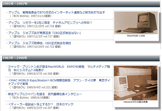 『週刊BCN』と連動するウェブサイト『BCN Bizline』内に開設した特設ページ<林檎はいくつ実ったか―― アップルのスティーブ・ジョブズ 『週刊BCN』で振り返る「革新」>から、リンクをたどって読むことができる記事は全部で126本(2011年10月20日時点)。それぞれ掲載媒体、掲載日を明記し、年度ごとに区切って紹介している。特に、PC・インターネットが本格的に普及する前の1983年~1997年の記事(『週刊BCN』掲載記事をそのままウェブに転載したもの)は、インターネット上ではなかなか読めない“時代”を感じるものばかり。当時を知る人は、懐かしく読んでいただけると思う。