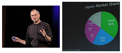 2005年8月4日のスぺシャルイベントでの1シーン。プレゼンテーションで触れられた「Japan Market Share」の数値は「BCNランキング」によるものだった(右)