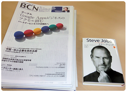 『週刊BCN』(左)とスティーブ・ジョブズ氏公認の自伝『スティーブ・ジョブズ』(日本語版)