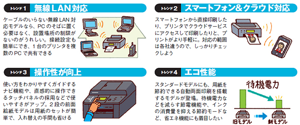 どこにでも置けて、ワイヤレスでプリントできるのが最新モデルのトレンド。無線LAN対応モデルは、上位モデルからエントリモデルへと拡大している。また、スマートフォンやクラウドサービスへの対応が進み、より手軽に印刷を楽しめるようになった。「エコ」もキーワードの一つ。便利な機能をチェックして、自分の使い方と予算に合ったモデルを選ぼう。