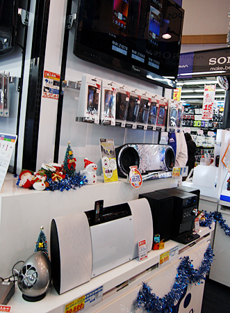 ビックカメラ有楽町店では、12月1日に1階の携帯オーディオコーナーをクリスマス仕様に変更。小さなクリスマスツリーやサンタクロースの人形を飾っている。オーディオコーナー担当の我妻高広さんに、携帯オーディオの売れ行きを聞いた。