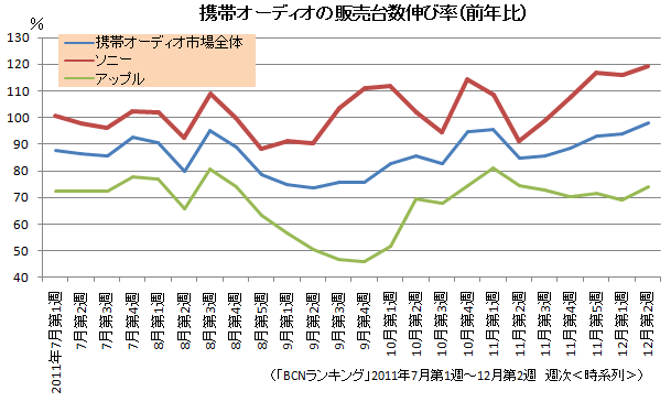 携帯オーディオ市場全体では、12月第2週(2011年12月12日~18日)で前年同月比97.9%とやや振るわないなか、ソニーは同119.2%と堅調な伸びを見せている。そのソニーの“ウォークマン”Zシリーズは、携帯オーディオの新しい楽しみ方を提案するモデルとして売り場で注目を集めている。
