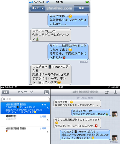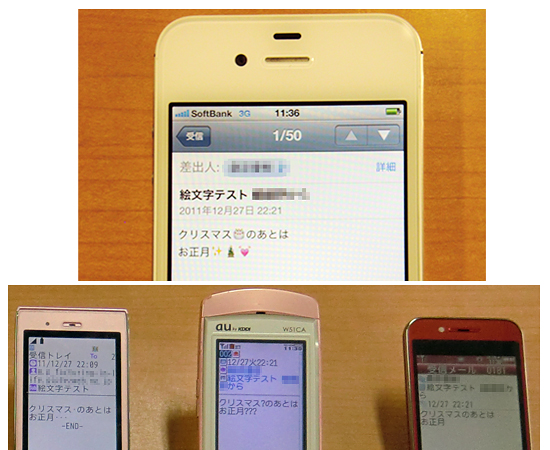 SB版iPhone 4S(上段)、iPad 2では絵文字が正しく表示されたが、ドコモの携帯電話(下段左)、auの携帯電話(下段中央)では絵文字部分が化けてしまい、ソフトバンクモバイルの携帯電話(下段右)では消えてしまった