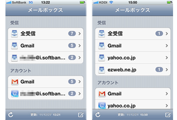 (左からSB版、au版。iCloudのメールはともに設定していない。Gmail、Yahoo!メールは、ユーザーが任意でインストールしたもの)