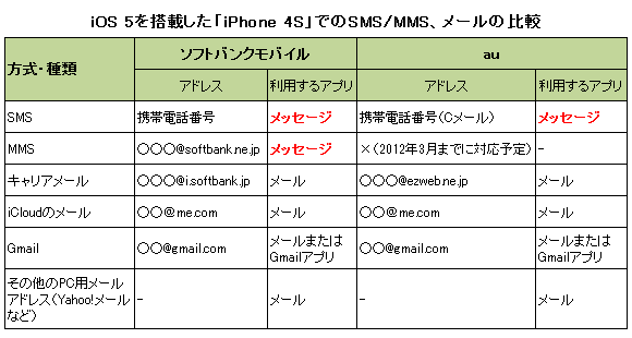 SB版iPhoneを新規で購入すると、キャリアから、MMS向けの「○○○@softbank.ne.jp」というアドレスと、メール向けの「○○○@i.softbank.jp」の二つのアドレスが提供される。さらに、「iCloud」を設定すると、好きなメールアドレス(○○○@me.com)を一つもらうことができる。SMS/MMSは、iOSデバイス間でメッセージや写真をやりとりできるiOS 5の新機能「iMessage」の機能を含んだメッセージアプリ(iOS 4までの旧名称「SMS/MMS」)で、メールはメールアプリを利用する。
