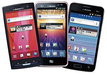 「Xi」対応スマートフォンで攻勢をかけるNTTドコモ。左から「ARROWS X LTE F-05D」「Optimus LTE L-01D」「GALAXY S II LTE SC-03D」