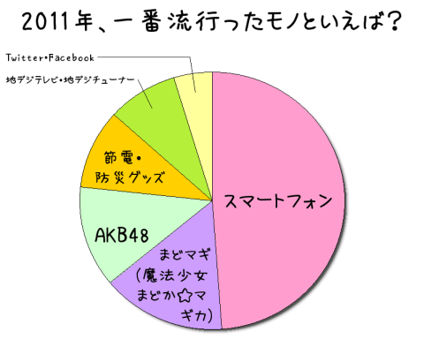1位は、361票で「スマートフォン」、2位は、112票でアニメファンの間で大いに話題になった深夜アニメ「魔法少女まどか☆マギカ(まどマギ)」でした。以下、アイドルグループの「AKB48」(94票)、「節電・防災グッズ」(74票)、「地デジテレビ・地デジチューナー」(64票)、企業のキャンペーンにも活用されることが増えて来たソーシャルメディアサービス「Twitter・Facebook」(35票)でした。