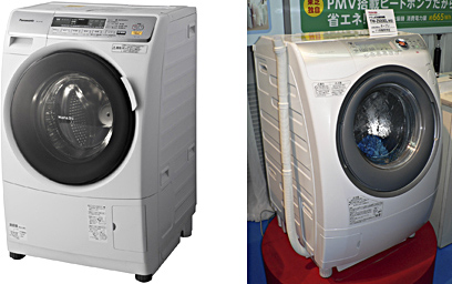 パナソニックのプチドラム「NA-VD110L」(左)は単身や少人数世帯などに人気。東芝ホームアプライアンス「TW-Z9200L」は、ジーンズやバスマットなどを1枚だけで洗ったときに時間通りに洗濯が終了しないことがあるというドラム式の弱点を解消