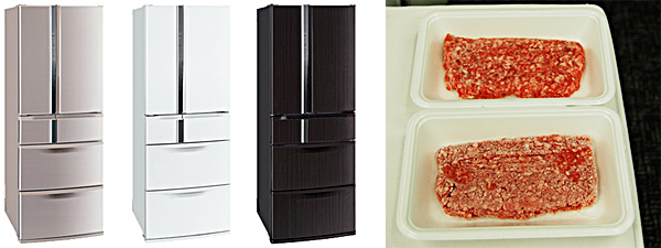 三菱電機「RXシリーズ」。右上の肉は、マイナス7度で冷凍した食材を凍ったまま簡単に包丁で切って解凍せずに調理できる(下は普通に冷凍した肉)