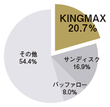 4GBのSDHCカード「SDHC4X4G」と、2GBのmicroSDカード「KMMCSD2GB-S」を筆頭に、手頃な価格でユーザーの支持を集めKINGMAXがシェアトップを獲得。サンディスクも信頼性を武器に僅差の2位を堅持し、強さを見せつけた。