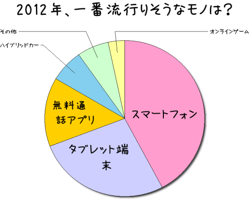 当サイトのミニコーナー「1クリック投票」の2012年1月のテーマ「2012年、一番流行りそうなモノは?」の投票結果をまとめました。個人的に気になるアイテム・サービスと「その他」の六つの選択肢を用意しましたが、1位は、昨年大いに話題を集めた「スマートフォン」でした。「BCNランキング」によると、すでに2010年10月以降、常に携帯電話月間販売台数の6割以上を占めており、携帯電話ユーザー全体に占める普及率も上昇しているでしょう。多少の障害や懸念があっても、スマートフォンの人気は続くと予想している人が多いようです。