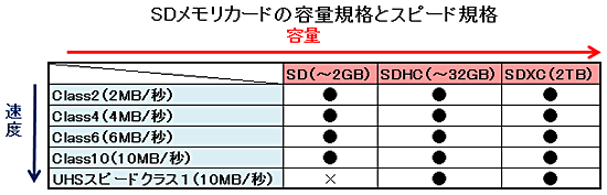 まずは容量。SDメモリカードは「容量の壁」といわれる規格上の容量限界がある。SDメモリカードは規格上2GBまでで、大容量化するために2006年に最大32GBまでの「SDHCカード」が、2009年に最大2TBまでの「SDXCカード」が生まれた。