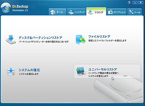 「ユニバーサルリストア」は、バックアップしたデータを、バックアップ元のPCとは別のPC(ハードウェア構成の異なる環境)へリストアする。通常、バックアップしたデータをバックアップ元と違うPCにリストアしようとしても、環境が異なるため完全にリストアすることができないが、この機能を使えば、自動で新しいハードウェアを検出し、システムがインストールされているパーティションをリストアする。リース期間の切れたPCから新しいPCにデータの引っ越しをするときに便利だ。