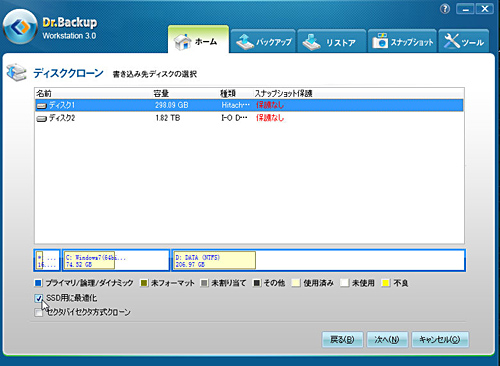 HDDからSSD環境への移行を考えている人も多いだろう。前述の「ディスククローン」で環境を移行することになるが、そのときに「SSD用に最適化」を指定すると、自動でSSDに最適化した形でディスクを複製する。なお、コピー先のディスクの容量は、コピー元ディスクの実際のデータ量より大きいサイズが必要となる。SSDは容量がHDDより小さいことが多いので、コピーするデータの大きさには注意しよう。