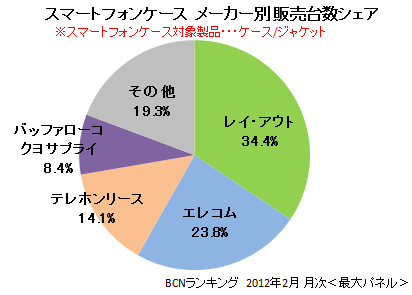 レイ・アウトは2011年のスマートフォンケース市場で28.6%のシェアを獲得し、1位に輝いたメーカーだ。今年に入ってもその勢いは止まらず、最新の2012年2月の「BCNランキング」では34.4%の高いシェアを獲得し、スマートフォンケース市場をけん引している。