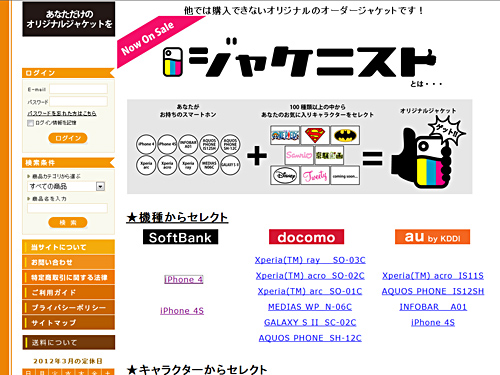 「ジャケニスト」は、2011年8月にスタートしたキャラクタージャケットケース作成サービス。サービス開始時点で、『ワンピース』『バットマン』『スーパーマン』『トゥイーティー』『ディズニー』のキャラクターケース約1000種類を用意していた。現在では、『サンリオ』、アニメ『京騒戯画』などが加わり、約4000種類から選択できる。