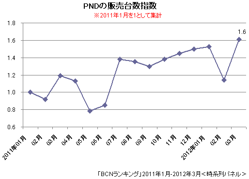 これまでカーナビといえば、クルマに取りつけたままで使う据置き型が圧倒的人気を誇っていた。しかし最近は、取り外して持ち運びができるコンパクトなPNDの人気が高まっている。BCNランキングで2011年1月からのPND販売台数指数を追うと、昨年の5~6月にモデルチェンジのために落ち込んだものの、夏のレジャーシーズンを機に盛り返し、今年2月の下降も3月にはすぐもち直している。2011年1月を基準とすると、市場は1.6倍にまで拡大しているのだ。