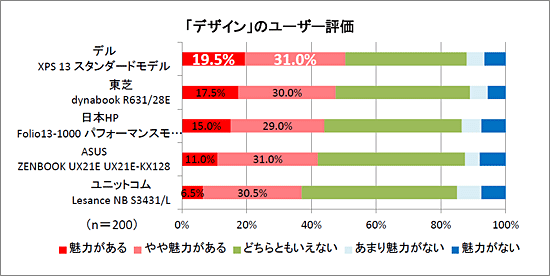 ウルトラブックの特徴である薄さや素材、質感などの「デザイン」では、デルの「XPS 13」が「魅力がある」「やや魅力がある」を合わせて50.5%で1位。続いて東芝の「dynabook R631/28E」が同47.5%で2位、日本HPの「Folio13-1000」が同44.0%で3位だった。