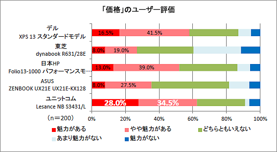 性能やデザインがどれほど魅力的でも、価格が高いとなかなか手を出しにくい。「価格」では、6万円を切るユニットコムの「Lesance NB S3431/L」が同62.5%で1位。2位は9万円を切るデルの「XPS 13」で、同58.0%、3位は8万円を切る日本HPの「Folio13-1000」で同52.0%だった。
