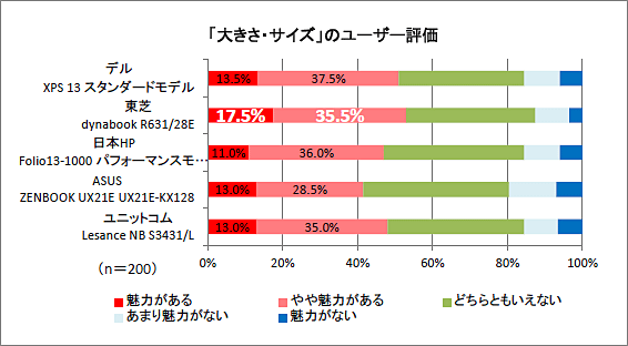 液晶サイズなどの「大きさ・サイズ」は、東芝の「dynabook R631/28E」が、同53.0%の支持を得て1位。2位はデルの「XPS 13」で同51.0%、3位はユニットコムの「Lesance NB S3431/L」で同48.0%だった。