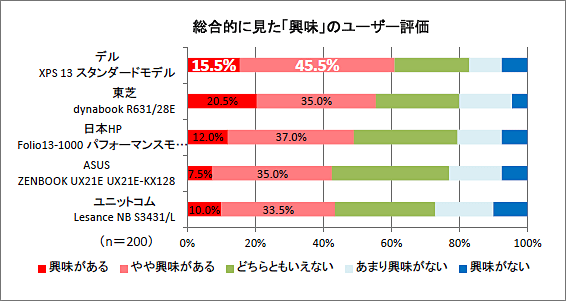 スペックや価格を確認したうえでのユーザーの興味度合いでは、1位はデルの「XPS 13」で「興味がある」「やや興味がある」を合わせて61.0%の支持を得た。2位は東芝の「dynabook R631/28E」で同55.5%、3位は日本HPの「Folio13-1000」で同49.0%という結果だった。