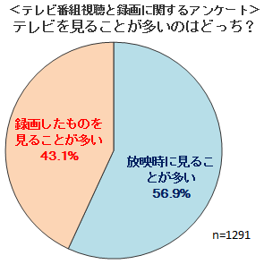 まず、テレビ番組を放送時間中に見ているか、録画して見ているか聞いた。43.1%が「録画したものを見ることが多い」と回答。放送時間に縛られず、時間が空いたときにゆっくり視聴する人が多いというのがわかる。