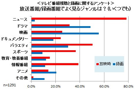 対して「録画して見るジャンル」は、「映画」が55.6%と最も多く、次いで「ドラマ」48.7%、「バラエティ」30.4%だった。番組特徴として、放送時間中に視聴する番組は速報性が求められる番組が多く、録画して視聴する番組は時間をおいて視聴しても困らないものが多いという結果だった。