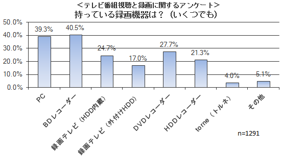 では、テレビ番組はどの機器で録画しているのだろうか。「ブルーレイディスク(BD)レコーダー」が40.5%と最も高く、2位は「PC」で39.9%だった。次いで「DVDレコーダー」の27.7%、「HDD内蔵の録画テレビ」の24.7%と続いた。