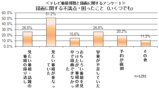 ただ、録画に対しては軒並み不満や困ったことを抱えているようだ。1位は「見たい番組が重なって録画できない」で51.2%、2位は同率で「見たい番組・話題の番組を録り逃した」「容量が不足していて録画できない」で、26.8%だった。