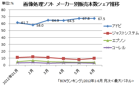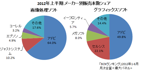 BCNは7月24日に、全国の家電量販店、パソコン専門店、ネットショップから集計した実売データ「BCNランキング」にもとづき、2012年上半期(1月~6月)に最も販売数量が多かった「上半期No.1メーカー」を発表した。アドビは「画像処理ソフト」と「グラフィックスソフト」の2部門で「上半期No.1」を獲得した。
