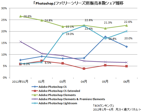 そして注目したいのが、「Adobe Photoshop Lightroom」シリーズだ。2007年に「Photoshop」ファミリーに加わったシリーズで、デジタル一眼レフカメラユーザーなど、本格的な写真を撮影、編集したい人向けの画像処理ソフトだ。6月のシリーズ別シェアでは20.2%と、定番の「Elements」シリーズに迫る勢いでシェアを伸ばしている。