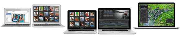 ノートブック型のMacのラインアップ。左から、MacBook Airの11/13インチモデル、MacBook Proの13インチ/15インチモデル、MacBook Pro Retinaディスプレイモデル