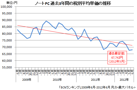 「BCNランキング」によると、ノートPCは値下がり傾向が続いている。3年前の2009年6月は8万2814円だったノートPCの税別平均単価は、その後しばらくは7万円~8万円台を保っていたが、2011年9月には6万円台に突入。2011年11月以降、7万円台に戻ったものの、2012年5月は過去最安値となる6万7742円まで下がった。一部の激安モデルが平均単価を下げていて、CPU、メモリ容量などのスペックにこだわらなければ、税込み4~5万円台から購入できる。