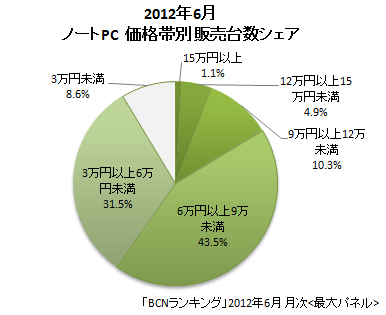 6月のノートPCの価格帯別販売台数構成比を集計すると、最も多い「6万円以上9万円未満」と次に多い「3万円以上6万円未満」だけで全体の75.1%を占め、最新CPUやBDドライブを搭載したスタンダードモデルが該当する「9万円以上12万円未満」でも10.3%にとどまる。「15万円以上」に至っては、わずか1.1%に過ぎない。ノートPCに限ると、「ハイエンドモデル」というカテゴリは事実上存在しないのだ。