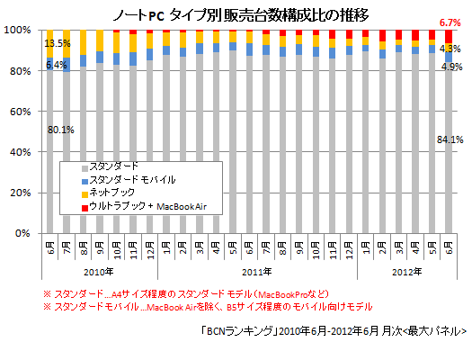 アップルの2011年のメーカー別販売台数シェアは4.3%で、NEC(20.1%)、東芝(19.3%)、富士通(16.8%)、ソニー(13.3%)、日本エイサー(9.2%)、レノボ・ジャパン(6.3%)、ASUS(5.5%)に次いで8位。ただし、他のメーカーより平均単価が高いので、金額ベースだとシェア6.0%で5位に浮上する。2012年1~6月の累計でも、台数で8位(4.5%)、金額で5位(6.5%)と、ほとんど変わっていない。