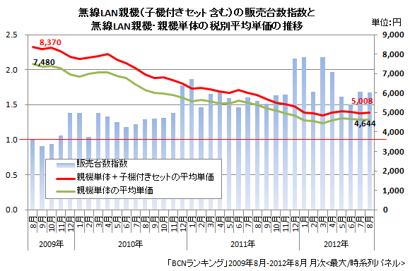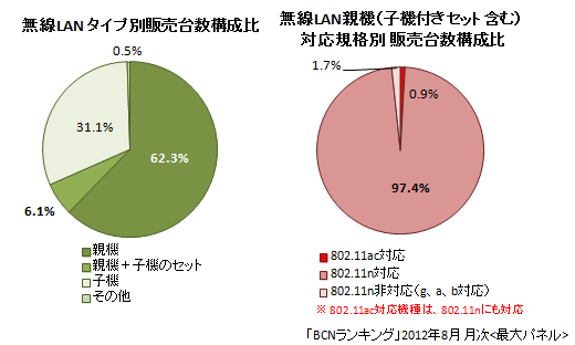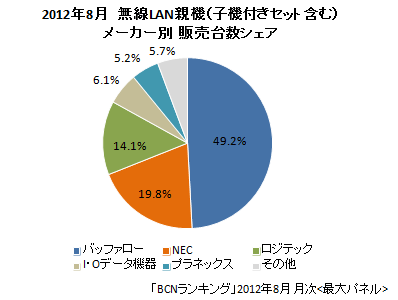 量販店の実売データを集計した「BCNランキング」によると、無線LAN親機・親機とセットモデルに限定した2011年のメーカー別販売台数シェア1位は、バッファロー。2012年も、8月末までの累計で、バッファローは、前年度と同水準の高いシェアを獲得し、他のメーカーを大きく引き離している。バッファローを筆頭に、NEC、ロジテックなど、上位5社だけで全体の約97%を占め、メーカーの選択肢は少ない。