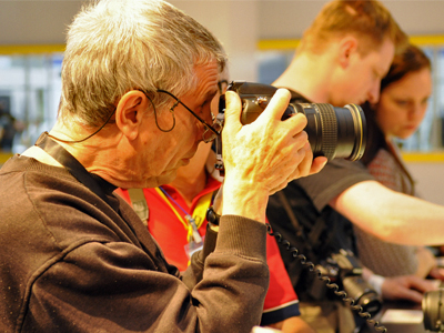 『D600』の使い勝手を試す来場者。カメラを真剣にいじる様子は万国共通だ