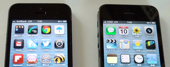 今回は、ソフトバンクモバイル版(SB版)とau版の2台の「iPhone 5」を持ち歩いて、iOSの標準ブラウザであるSafari、メッセージアプリ、iPhone用Twitter公式アプリ、iPhone用公式Gmailアプリを主に使いながら、LTEの電波状況・速度、使い勝手を比較した。なお、通話に関しては、試していない。また、通信速度計測アプリで測った数値以外は、筆者の体験にもとづく主観的な感想であることを申し添えておく。