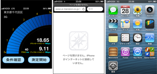 auの「iPhone 5」では、LTEから3Gへの切り替え時に「○」マークが表示され(中央)、そのまま通信がストップしたこともあった