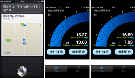 「こだま」の窓際の席に座り、各駅の停車中に通信速度を計測。掛川駅・岐阜羽島駅・米原駅はSB版がLTE、au版が3G、三島駅はSB版が3G、au版がLTE、新横浜駅・熱海駅はともに3Gだった。その他の駅では、どちらもLTEだった。