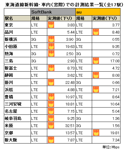東海道新幹線「こだま」の車内(終着駅を除く)で停車中に計測。LTE/3G問わず、数値の高かったほうに王冠マークを付与した。