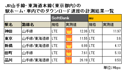 通信速度は利用人数や時間帯、環境などによって変わり、一定ではない。アンテナの表示本数も駅によってマチマチだったので、単純には比較できないが、計測するたびに速度が大きく異なっていた東京駅・品川駅・新大阪駅を除く14駅中10駅で、ソフトバンクモバイルの「iPhone 5」のほうが速かった。なかでも米原駅(滋賀県)では、東海道線新幹線車内では最高値の32.51Mbpsを記録した。