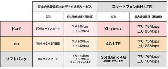 「LTE」とは「Long Term Evolution(ロング・ターム・エボリューション)」の頭文字をとったもので、携帯電話のデータ通信を高速化した通信規格。これまでは、メールを送受信したり、携帯用サイトを閲覧したりするときに利用することが多かったデータ通信だが、スマートフォンやタブレット端末が急速に増え、音楽や動画をダウンロードしたり、PCサイトを閲覧したり、動画をストリーミング再生したりと、より高速通信が求められるようになった。
