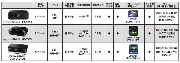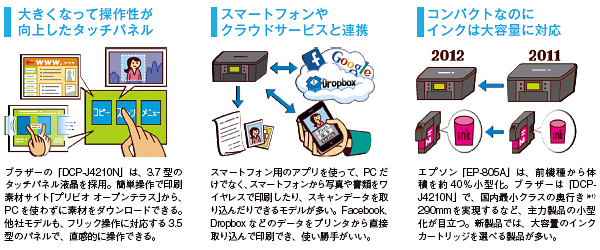 新モデルで目立つのが「小型化」だ。各社の主力モデルは、小さくなったにもかかわらず、大容量のインクカートリッジに対応。交換の手間とコストを少なくしている。また、スマートフォンや各種クラウドサービスとの連携も、標準機能になりつつある。各社ともスマートフォン向けのオリジナルアプリを用意し、タッチパネル液晶からの操作でPCを使わずにクラウド上のファイルを印刷できる。さらに、一部のモデルは、A3プリントに対応したり、アプリを使って遠隔地から電源を入れ印刷できたり、数年前のモデルでは考えられない便利機能が満載だ。
