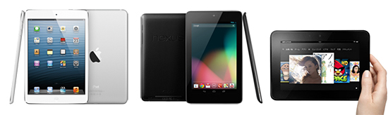 増えてきた7インチタブレット(左からiPad mini、Nexus 7、Kindle Fire HD)。