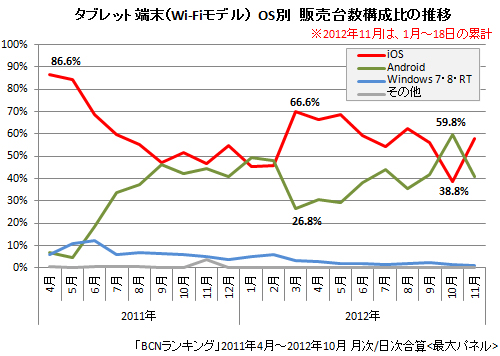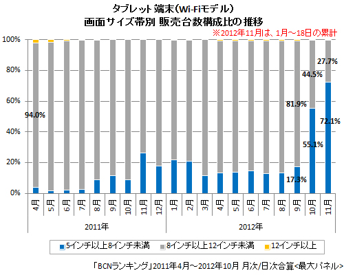 アップルは、従来のiPadより小型の7.9インチディスプレイを搭載した「iPad mini」のWi-Fiモデルを11月2日に発売した。予約せずに購入できる店が多いこともあって、売れ行きは好調だ。ASUSの7インチタブレット「Nexus 7」も売れている。Androidベースの7インチタブレット「Kindle Fire HD」も12月に発売予定。新OS「Windows 8」の特徴を生かして、キーボード部分を取り外すとタブレット端末として使えるノートPCもいくつか発表されている。OSや画面サイズのバリエーションが増え、これまでアップルのiPadがほぼ独占していた「タブレット」の選択肢が増えてきた。
