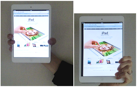 男性ならスマートフォンと同じように片手でつかめるiPad mini(写真左)。しかし、女性(写真右)や手の小さな子どもだと両手でなければ持てない
