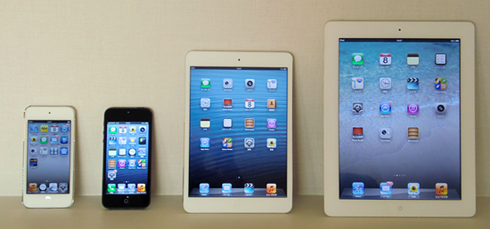 (左から、第5世代iPod touch、iPhone 5、iPad mini、第4世代iPad Retinaディスプレイモデル)