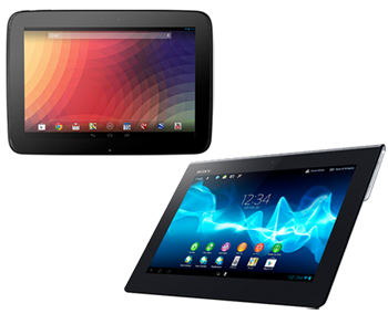 最新のAndroid 4.2を搭載した10インチの「Nexus 10」(左)と、ブランド名をスマートフォンと同じ「Xperia」に変更した9.4インチの「Xperia Tablet S」